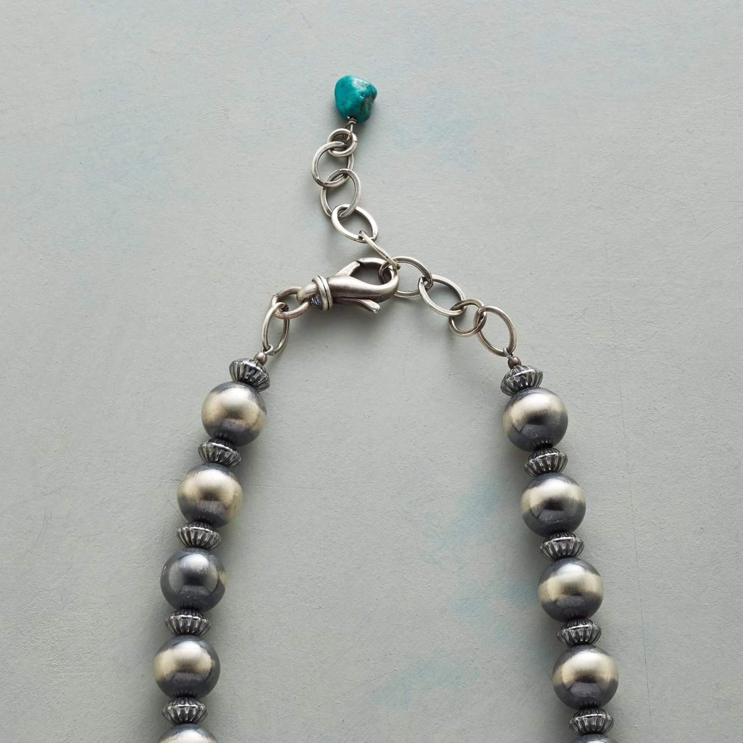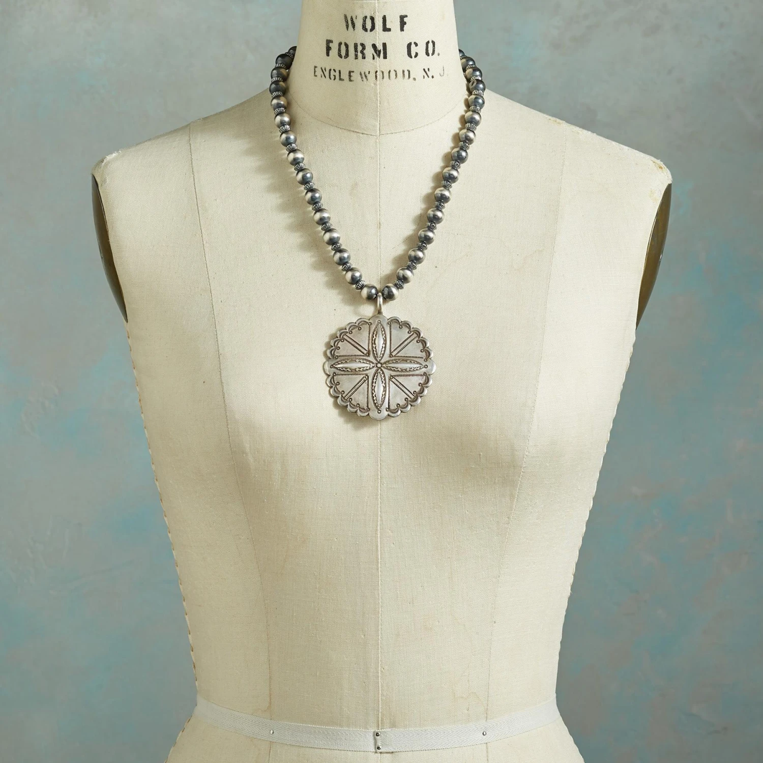 By the renowned Southwestern artist Buffalo, this sterling silver necklace melds traditional Native American silver-working techniques, including hand-stamped designs, repoussé and fluted beads, with modern elegance. Sterling lobster clasp with turquoise accent. USA. Exclusive. 19″ to 20-1/2″L x 3/8″W chain, 2-3/8″ dia. pendant.
