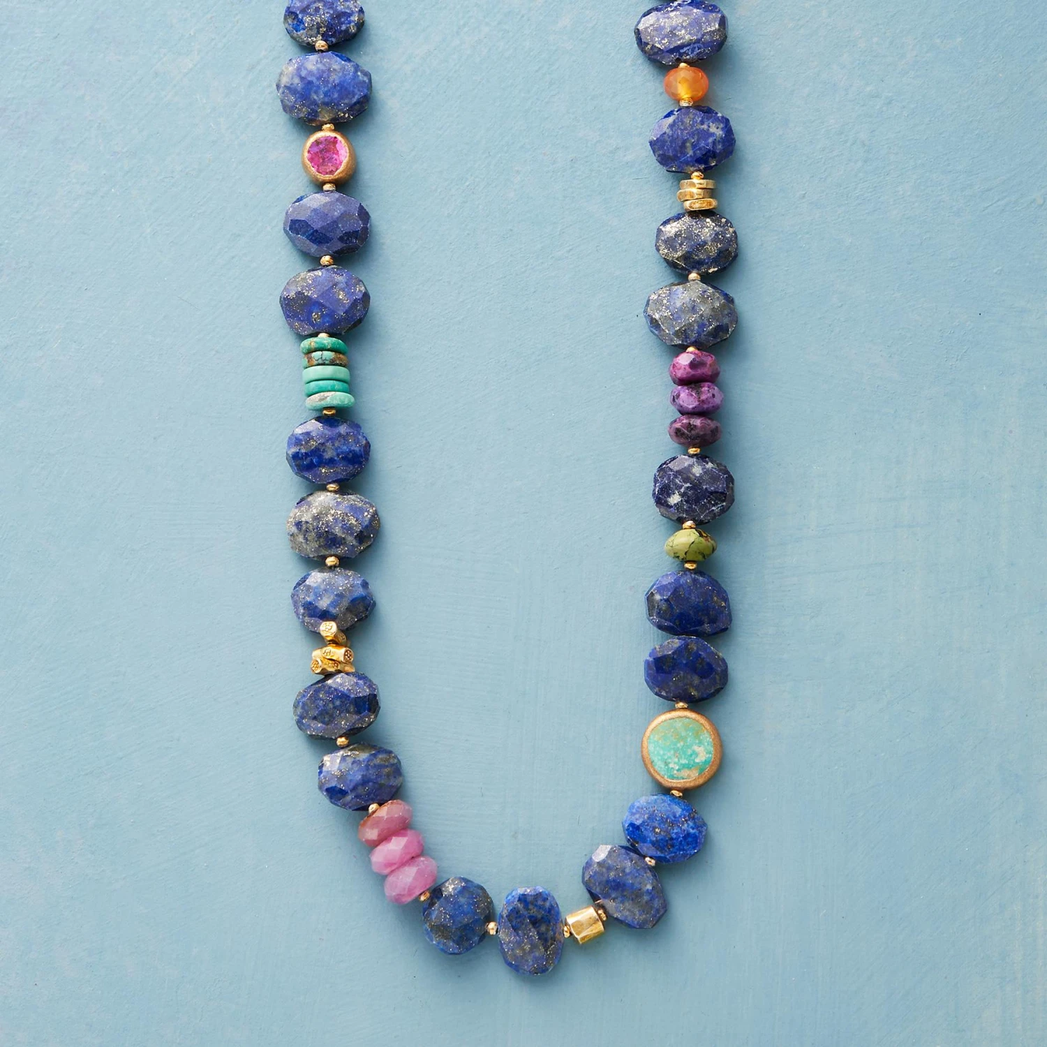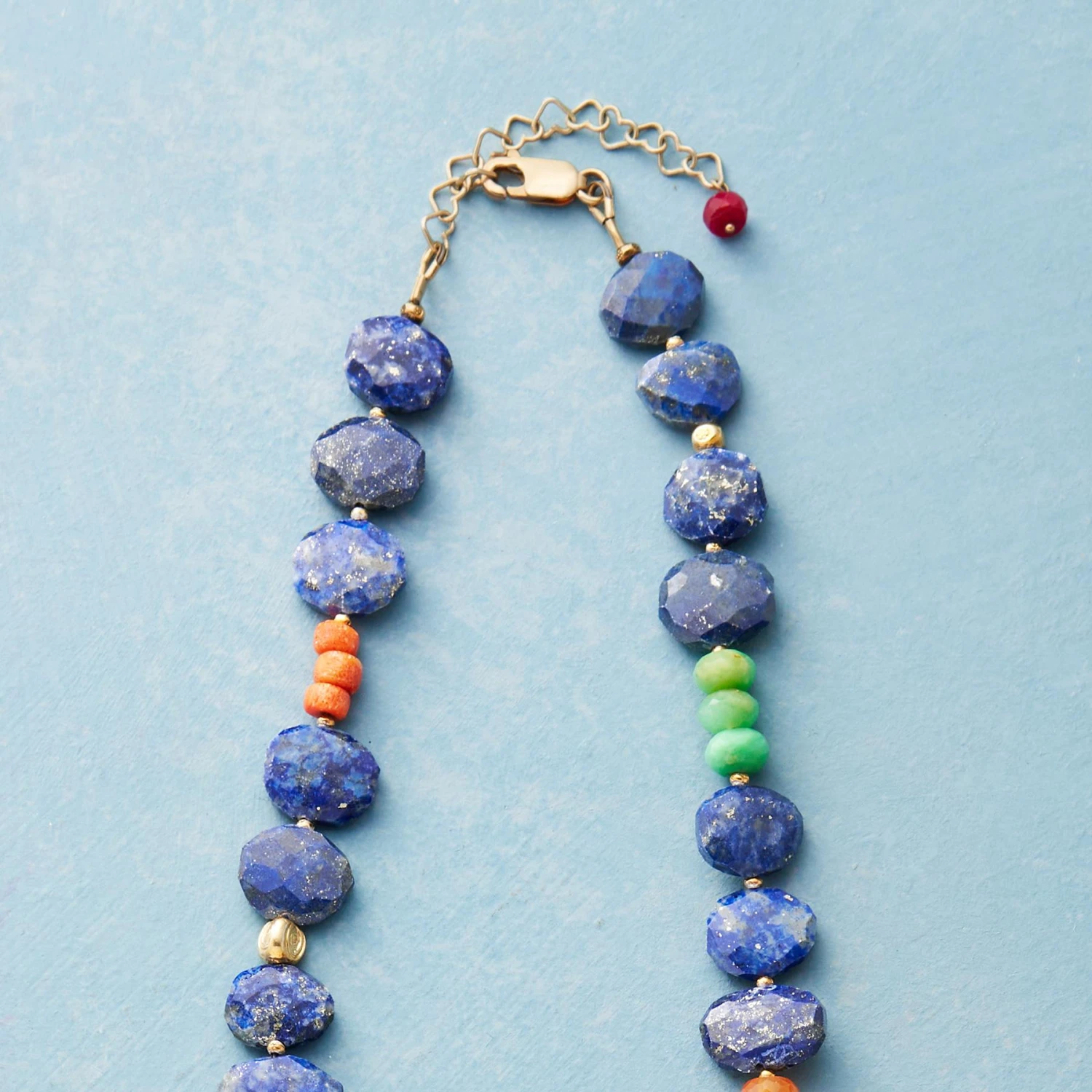 Inky lapis anchors a palette inspired by Egyptian treasures. Handcrafted in USA with carnelian, ruby, stabilized turquoise, 22kt gold plated beads and more. Exclusive. 14kt gold filled lobster clasp. 20″ to 22″l.