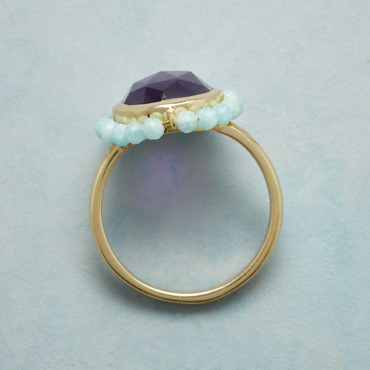 Our 14kt gold vermeil amethyst ‘Antoinette’ ring sets up an uncommonly pretty, eye-catching contrast pairing a faceted, window-set gem with tiny petals of amazonite. Exclusive. Whole sizes 5 to 9.