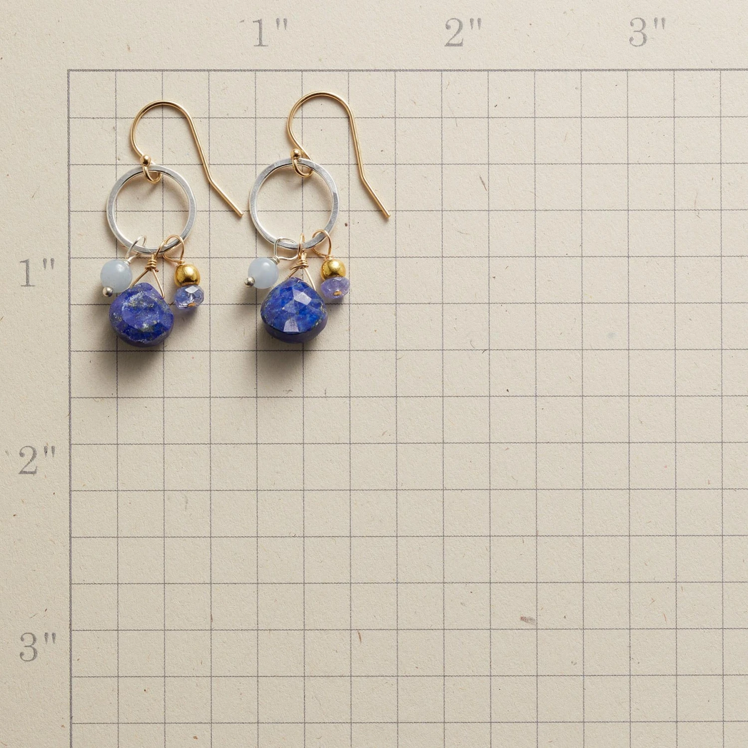 Lapis, aquamarine and tanzanite linked to sterling silver hoops with a mix of sterling silver and brass accents. Exclusive. Handcrafted in USA. 14kt gold-filled French wires. 1-3/8″L.