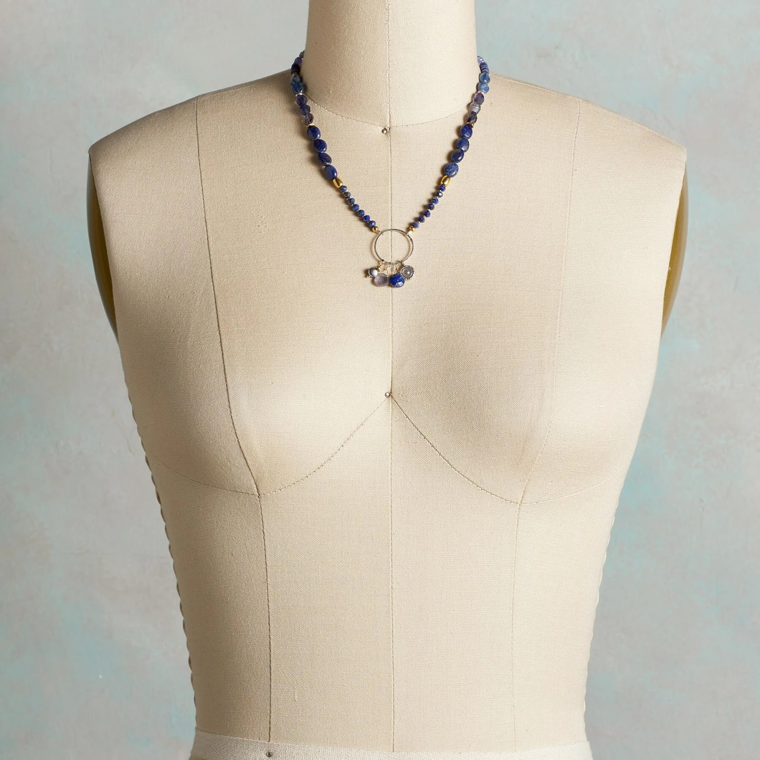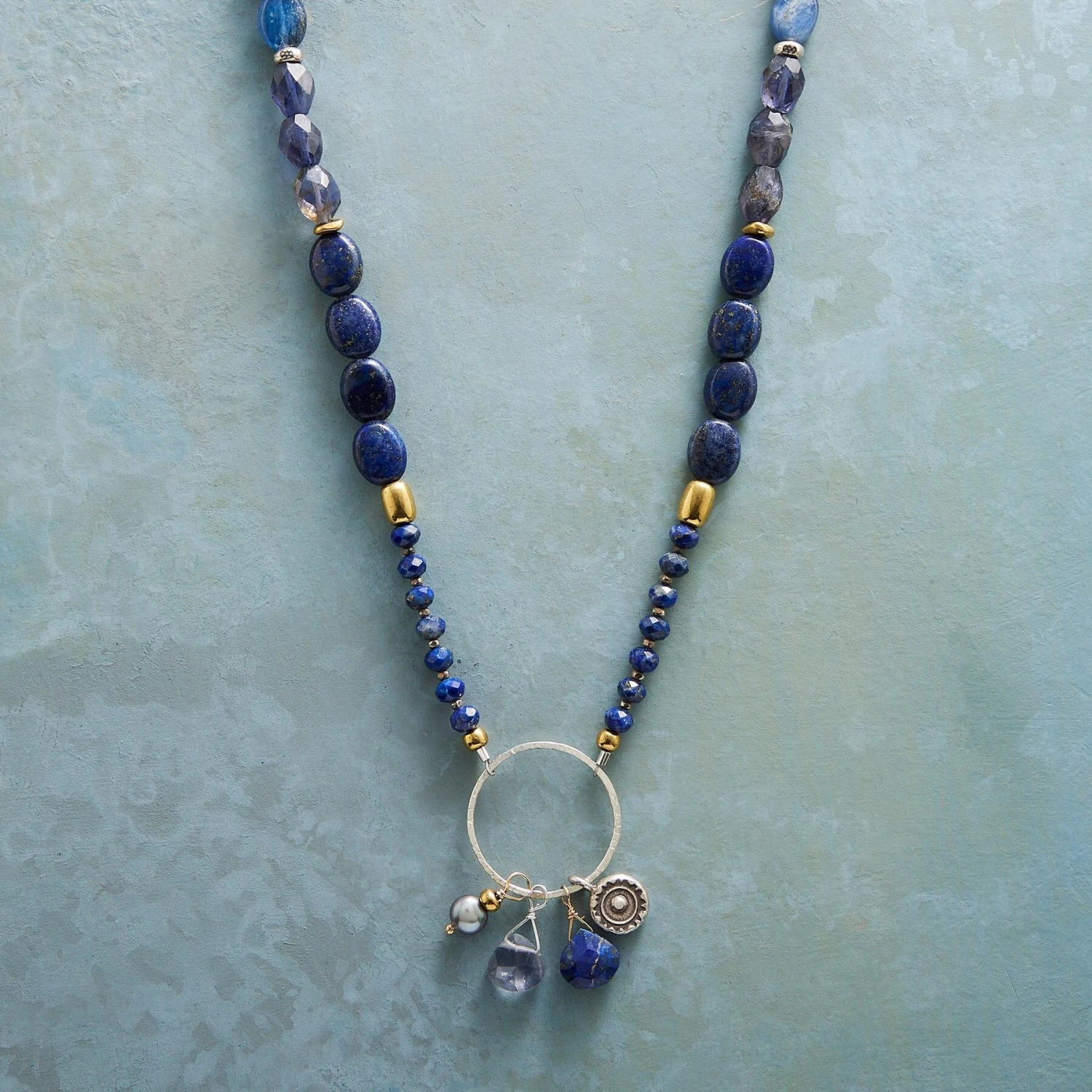 Lapis, iolite, cultured peacock pearl, brass bead and stamped Thai silver charm dangle from a ring of sterling silver. Kyanite, tanzanite and aquamarine on strand. Exclusive. Handcrafted in USA. Lobster clasp. 17″L.