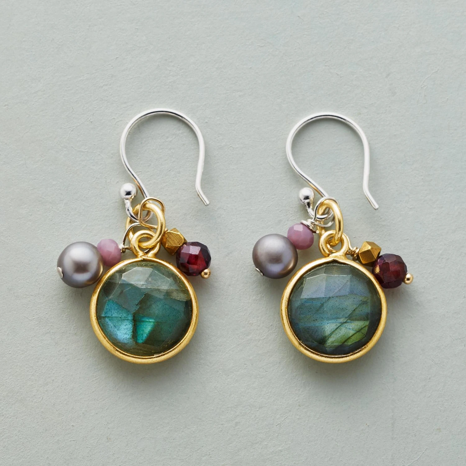Labradorite circled in 18kt gold vermeil joins drops of garnet, lavender jade, and tinted freshwater pearl in lovely little danglers dancing on sterling silver wires. USA. Exclusive. 1″l.