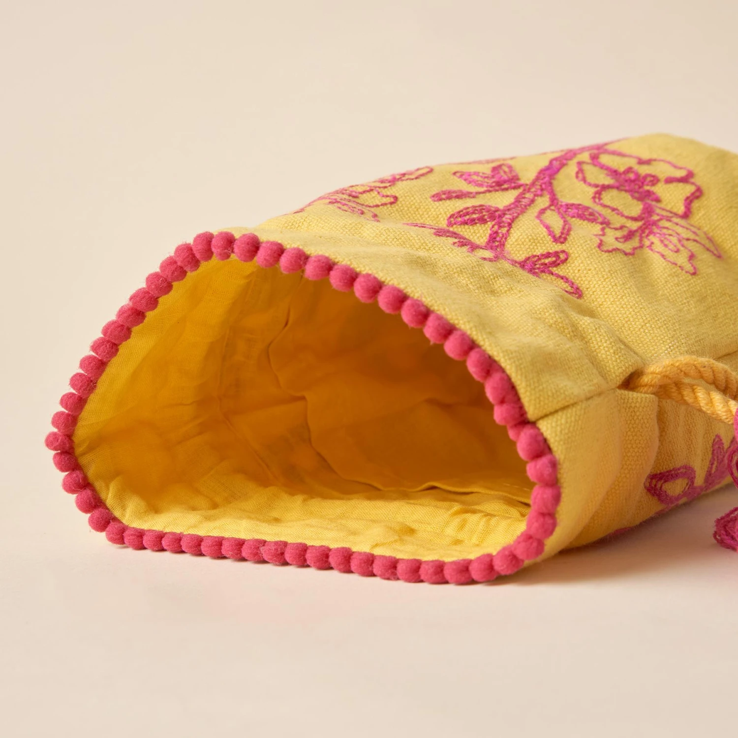 Embroidered with birds on blooming branches, our cotton canvas jewelry keepers are as bright and beautiful as they are useful. Each drawstring pouch offers ample room for baubles and bangles, plus slip pockets around the interior to organize studs, rings and other small treasures. Trimmed with mini ball fringe. Imported. Exclusive. 7-1/2″h x 4-1/2″ dia.