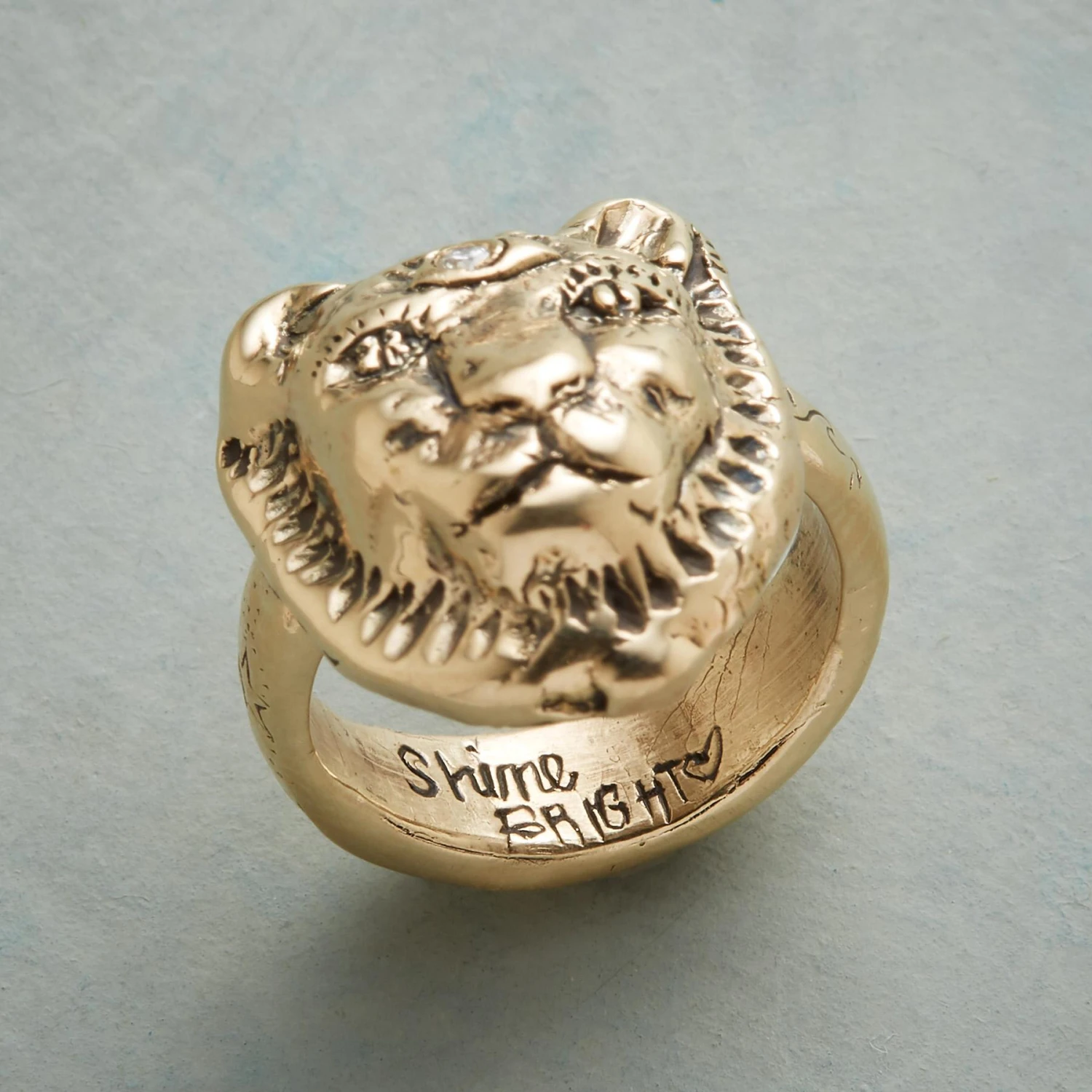 Fiercely protective, powerfully brave, a lioness roars on Jes MaHarry’s 14kt yellow gold ring set with a single diamond and etched with the words “shine bright.” Made in USA. Exclusive. Whole sizes 5 to 9.