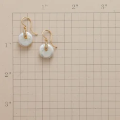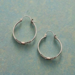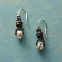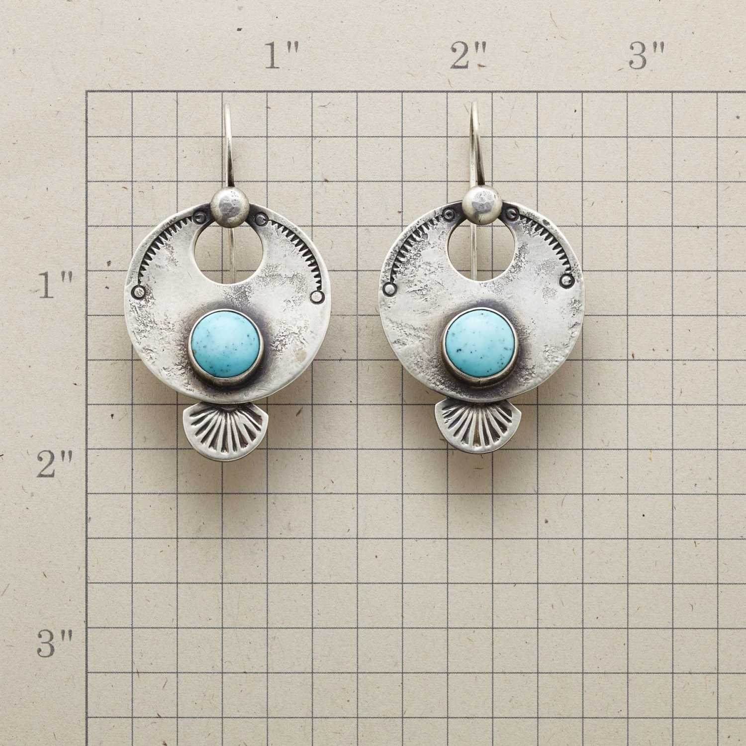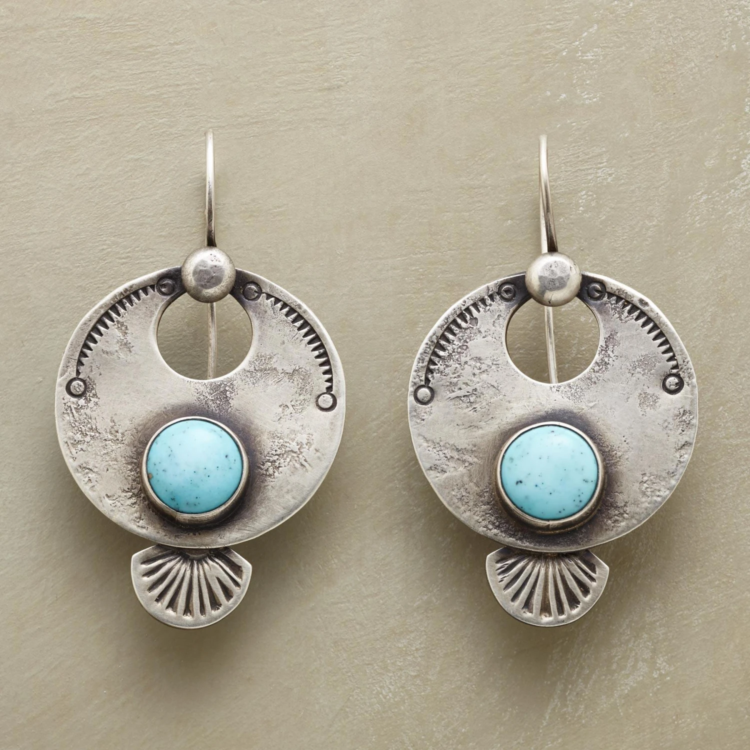 Handstamped sterling silver disks set with turquoise hang from sterling wires in these timeless earrings by Southwestern artist Dennis Hogan. USA. Exclusive. 2″L.