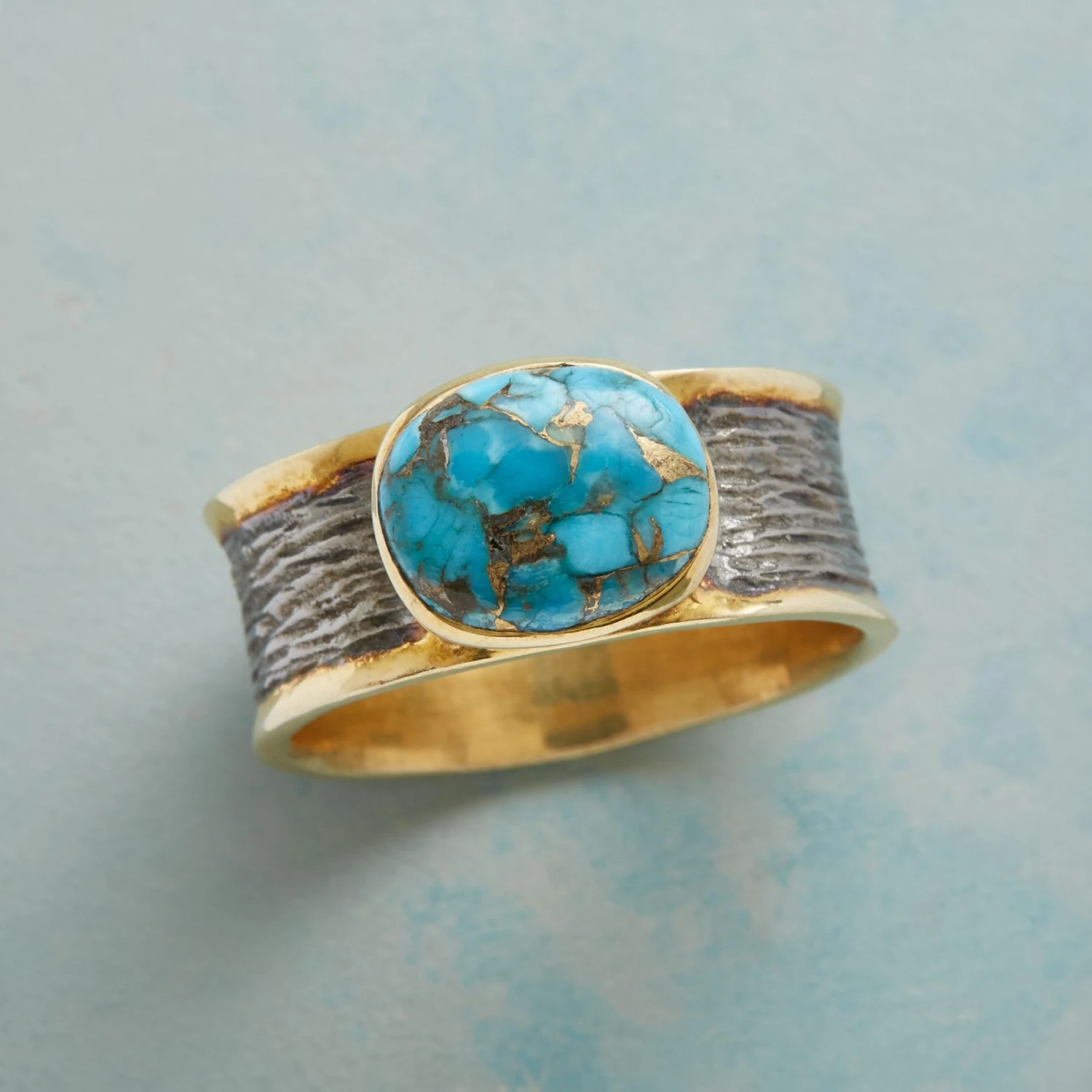 Each stone’s bold, unique matrix emerges from a composite of copper and turquoise. Polished 14kt vermeil offset by bark textured black ruthenium. Handcrafted exclusive. Whole sizes 5-9.