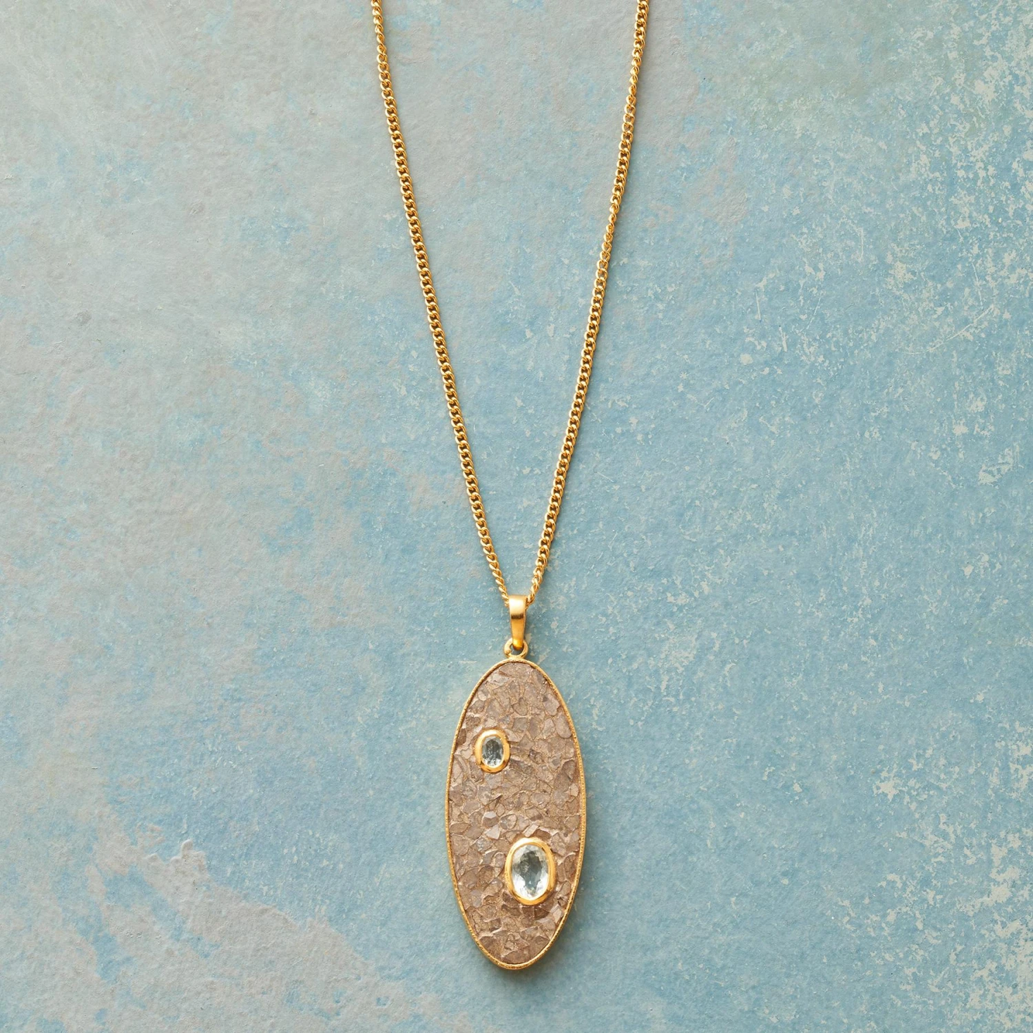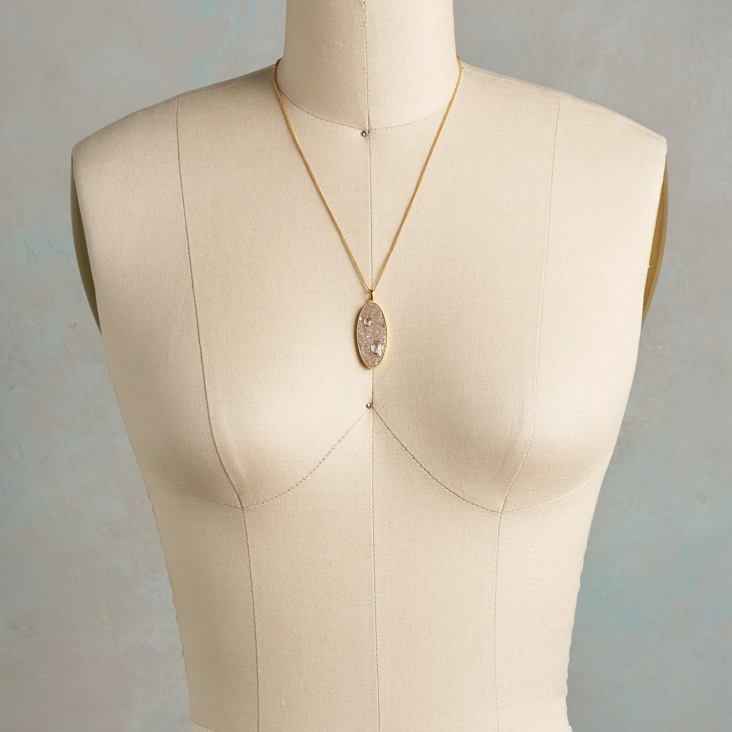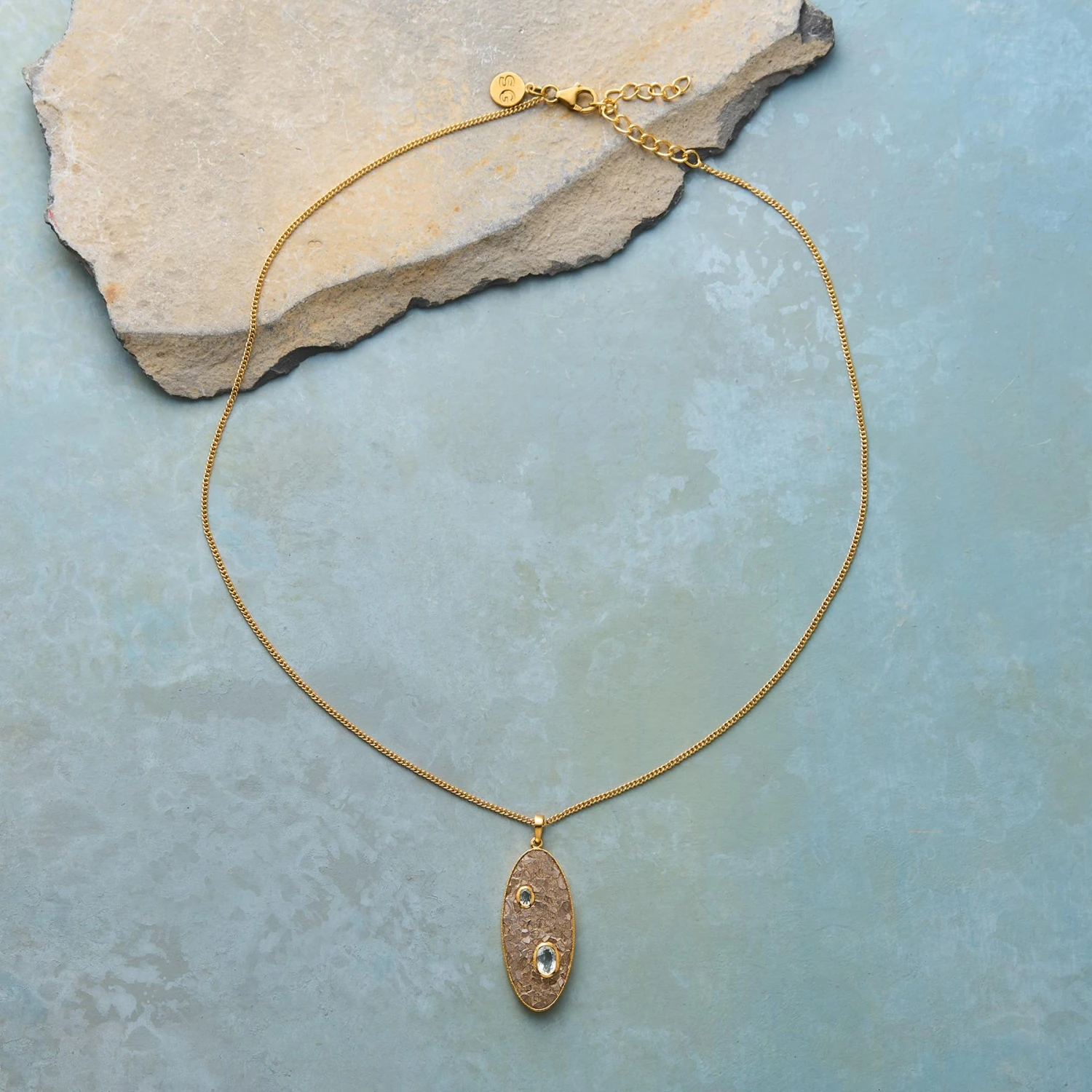 Aquamarine floats amid raw, uncut diamonds, the gemstone lagoon gleaming in golden surrounds. Exclusive. Handcrafted in 18kt gold vermeil. Lobster clasp. 18″-20″L. 1-5/8″ drop.