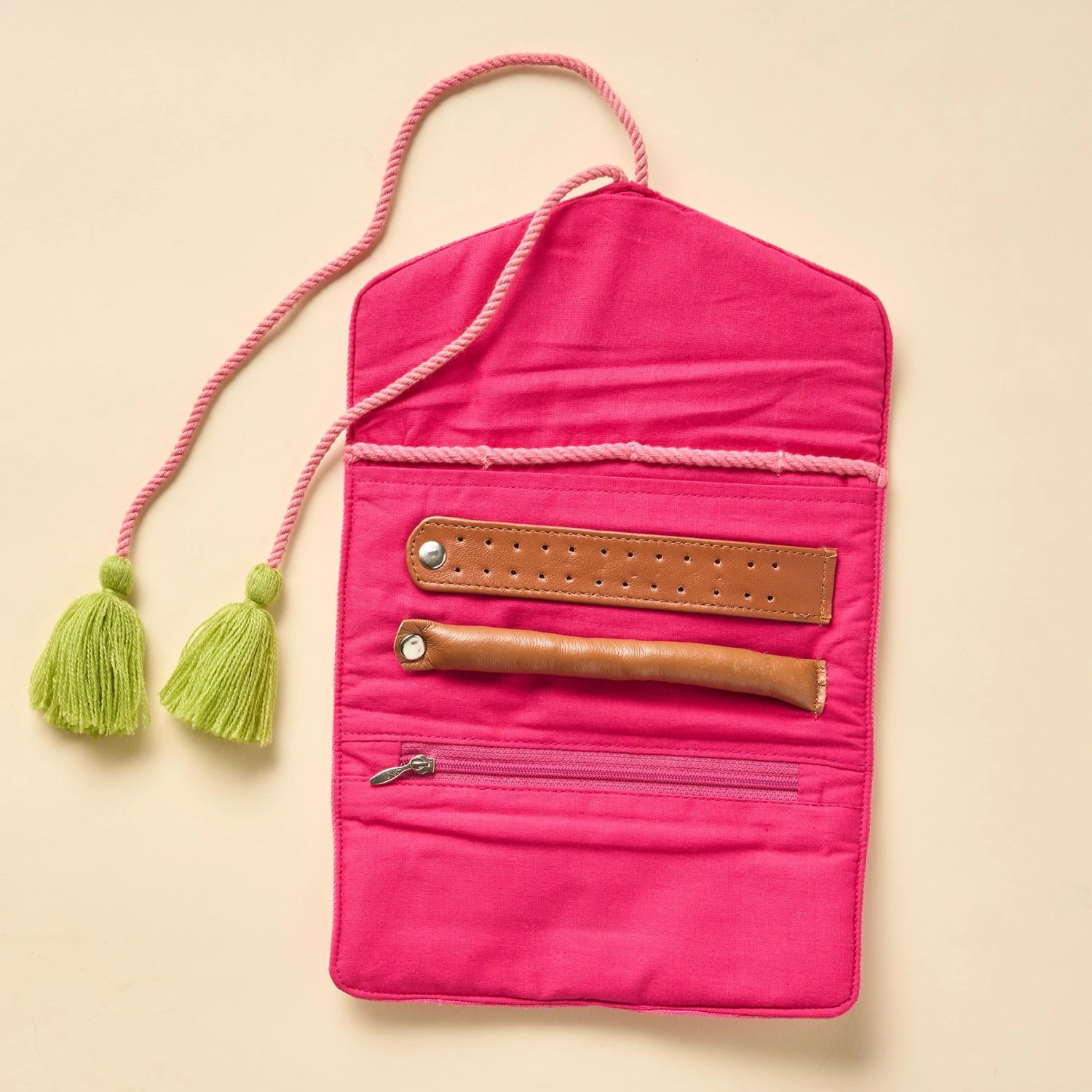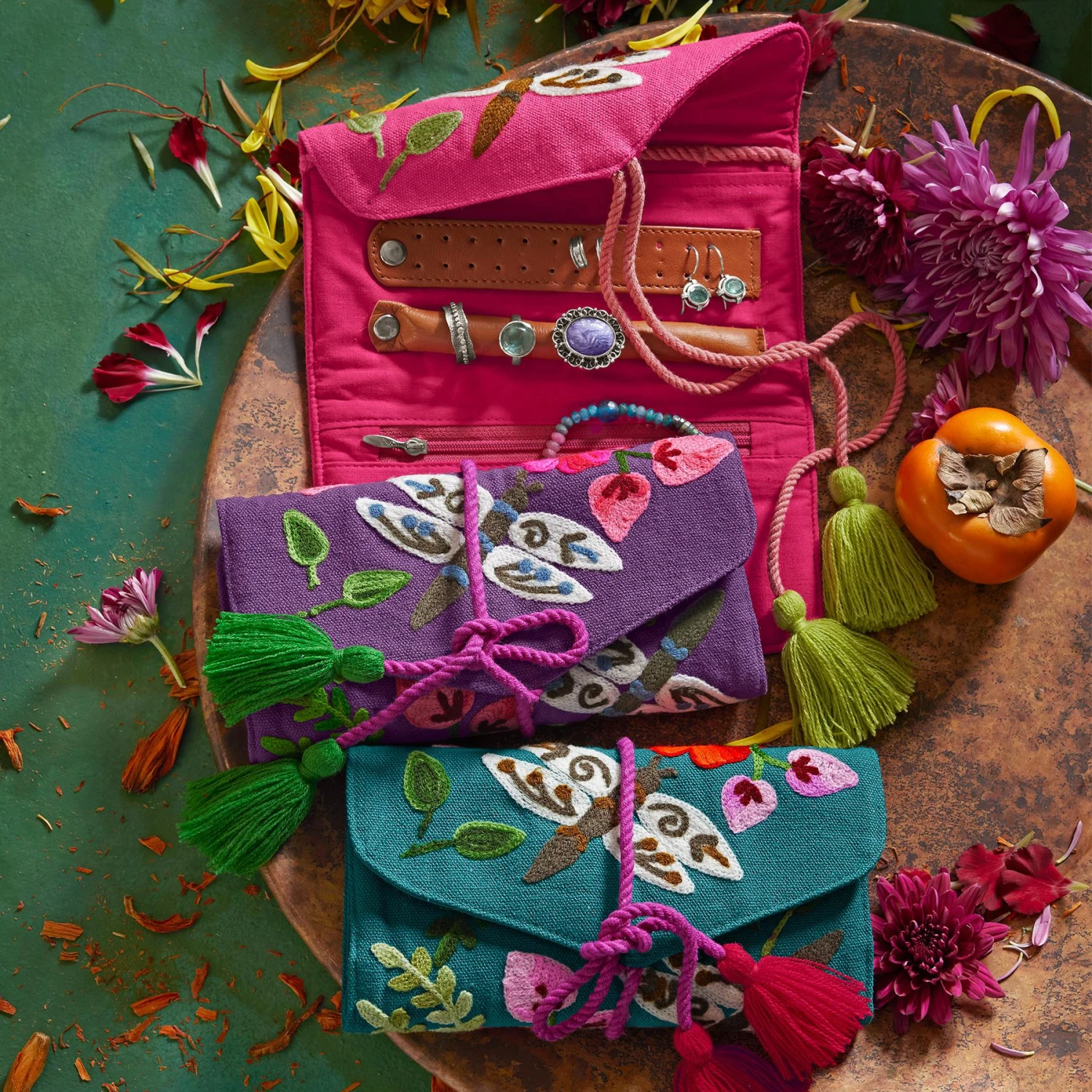 Jewelry travels beautifully in this embroidered jewelry organizer featuring a zipped pocket, a large slip pocket, a snap ring roll and a snap panel for twelve pairs of earrings. This design folds up and secures with a tasseled rope. Cotton. Exclusive. 11-1/2″L x 7-1/2″W.