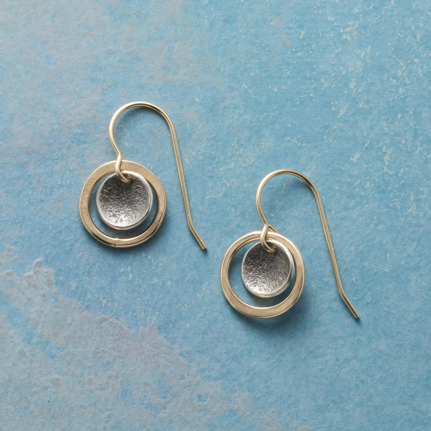 Diminutive cups of sterling silver rest within circles of 14kt gold filled, their tones and textures contrasting and complementing each other as they sway. 14kt gold-filled French wires. Handcrafted in USA. Exclusive. 3/4″L.