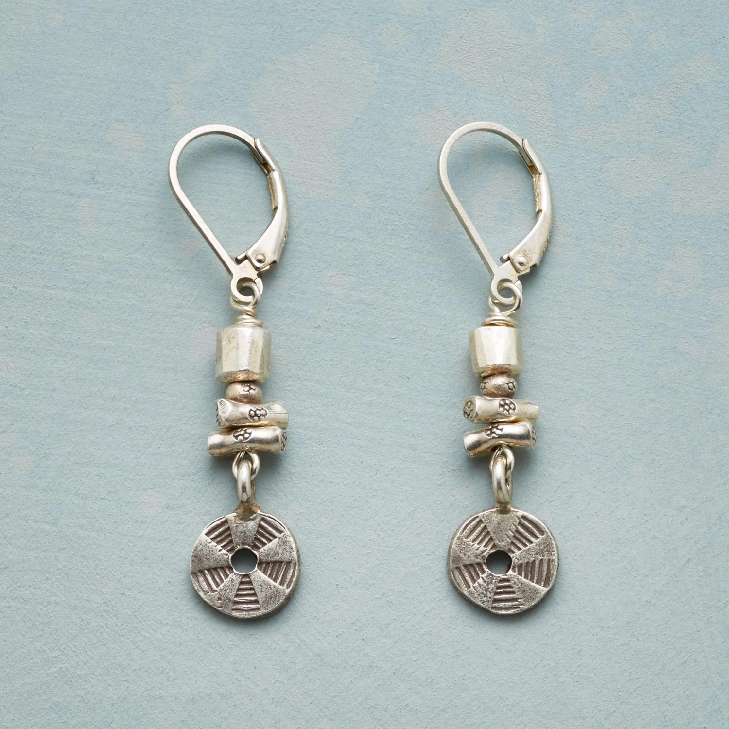 Stamped Thai silver beads ending in a shining pinwheel sway from the ears like wind chimes in the breeze. Sterling silver lever back wires. Handcrafted in USA. Exclusive. 1-3/4″l.