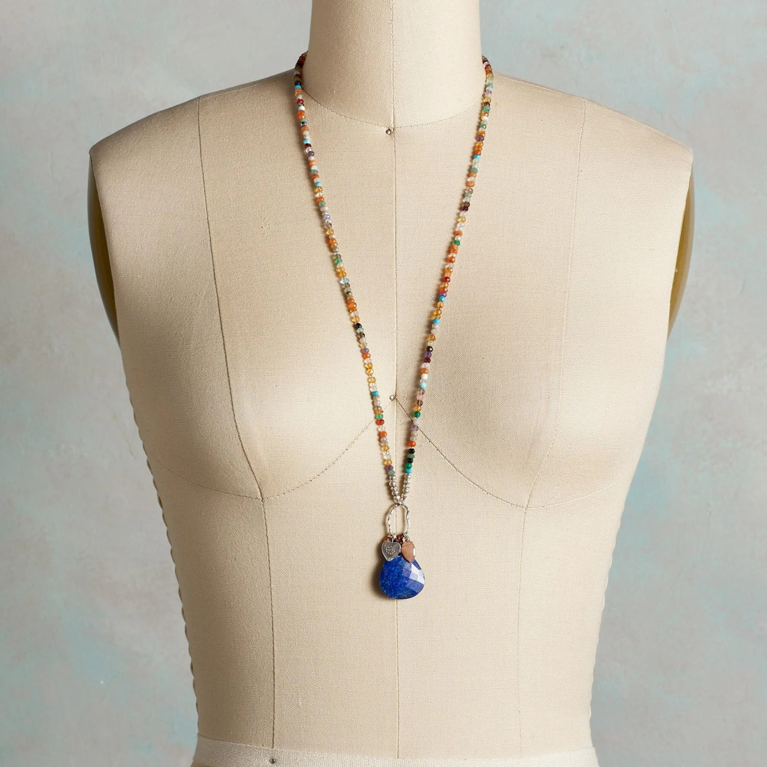 The fun is in the sheer variety of gems, each strand one-of-a-kind. Carnelian, amethyst, citrine and more lead to a faceted lapis teardrop and Thai silver charms. Exclusive. Handcrafted in USA. Lobster clasp. 28″L; 2″ drop.