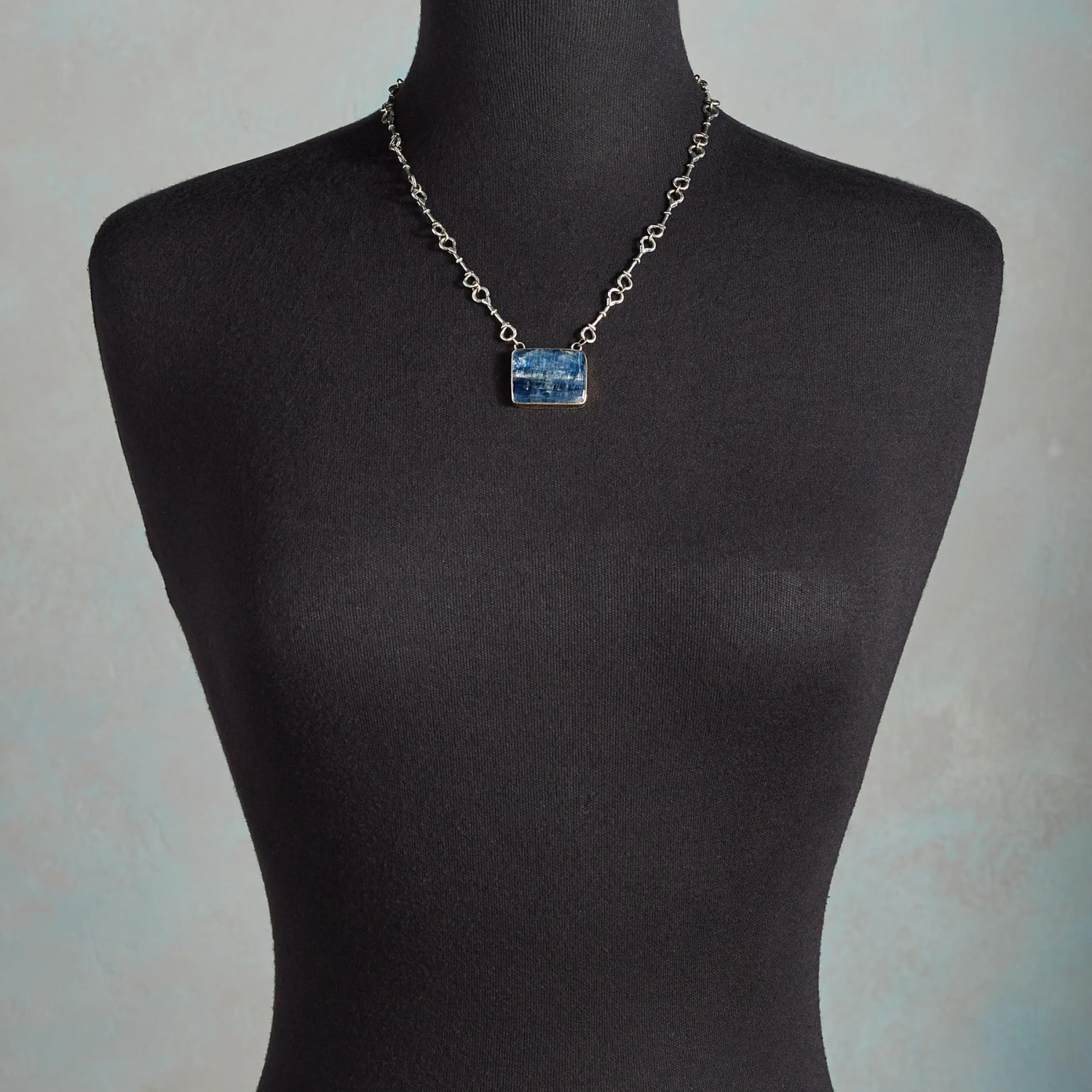 Jes MaHarry makes an impressive showing of blue kyanite, suspending each one-of-a-kind stone from her custom barbell links. Engraved on reverse: “live each moment with love.” Handmade in USA of sterling silver; 14kt gold bezel and jump rings. Lobster clasp. Exclusive. 18-1/2″ to 20″L.