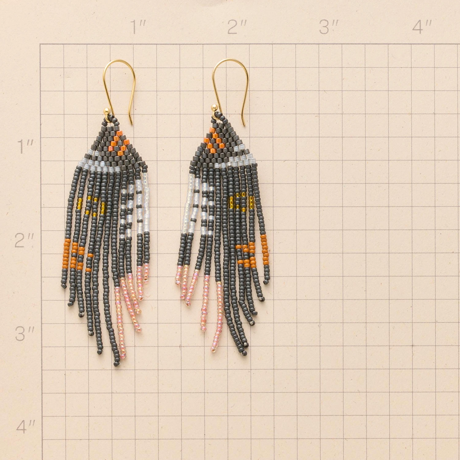 Triangular weavings cap long, flowing fringes of Japanese glass beads…mostly matte, some sparkling with every move. 14kt gold-plated French wires. Handcrafted. 3-1/8″l.