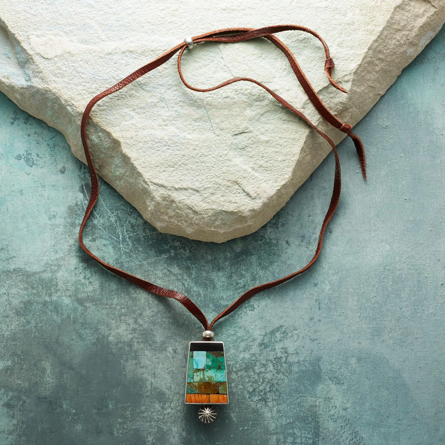 Jesse Robbins frames hand-cut tiles of jet, Nevada turquoise and spiny oyster shell in sterling silver, finishing each one-of-a-kind piece with a fluted bead. Threaded soft leather with a sterling slider. Handmade in USA. Exclusive. 34″L, Pendant 2″L.