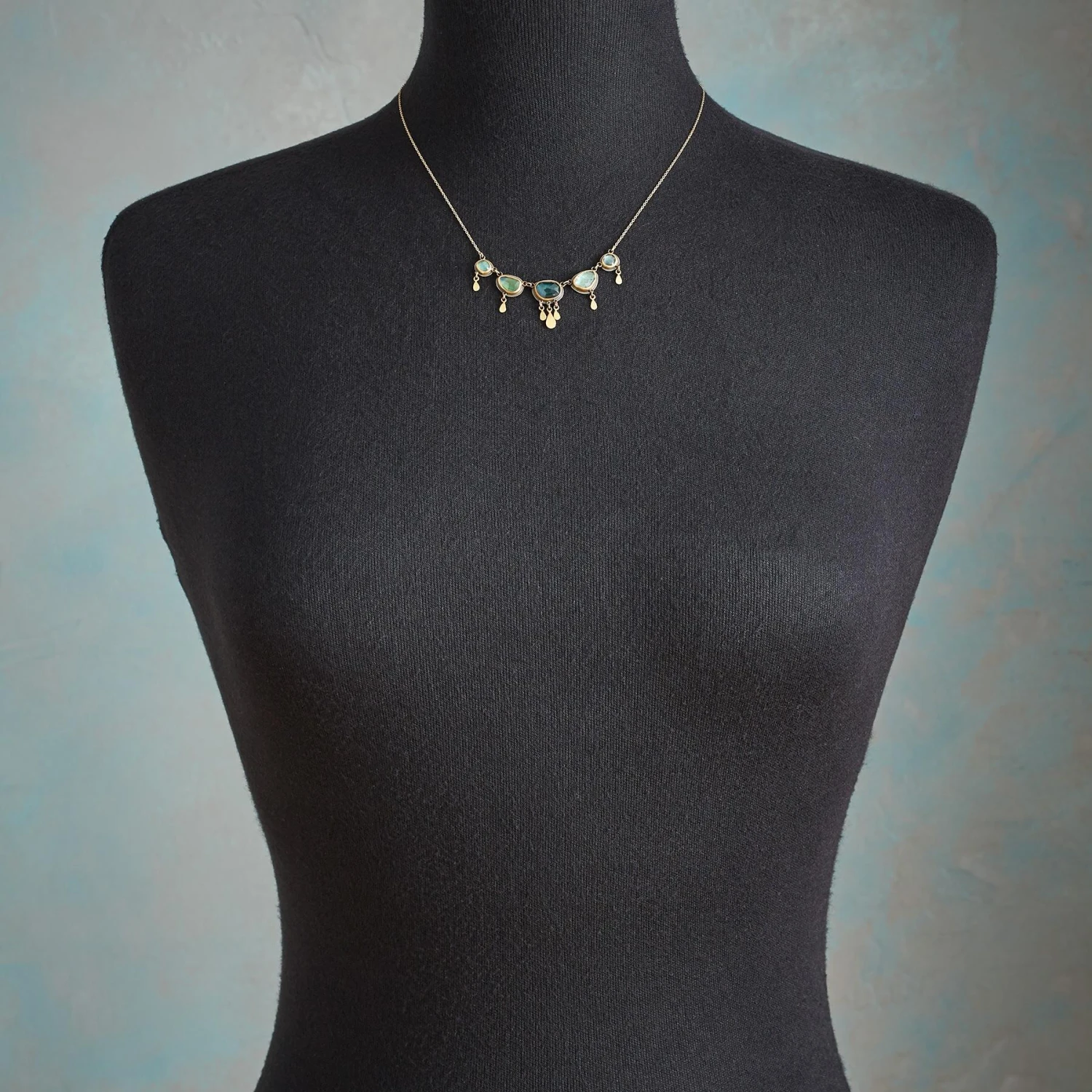 A graduated quintet of green tourmaline reveals the gem’s enchanting range of hues. Each is hand set on sterling silver with matte 22kt gold bezels and droplets. By Ananda Khalsa. 14kt chain and lobster clasp. Made in USA. 16″L.