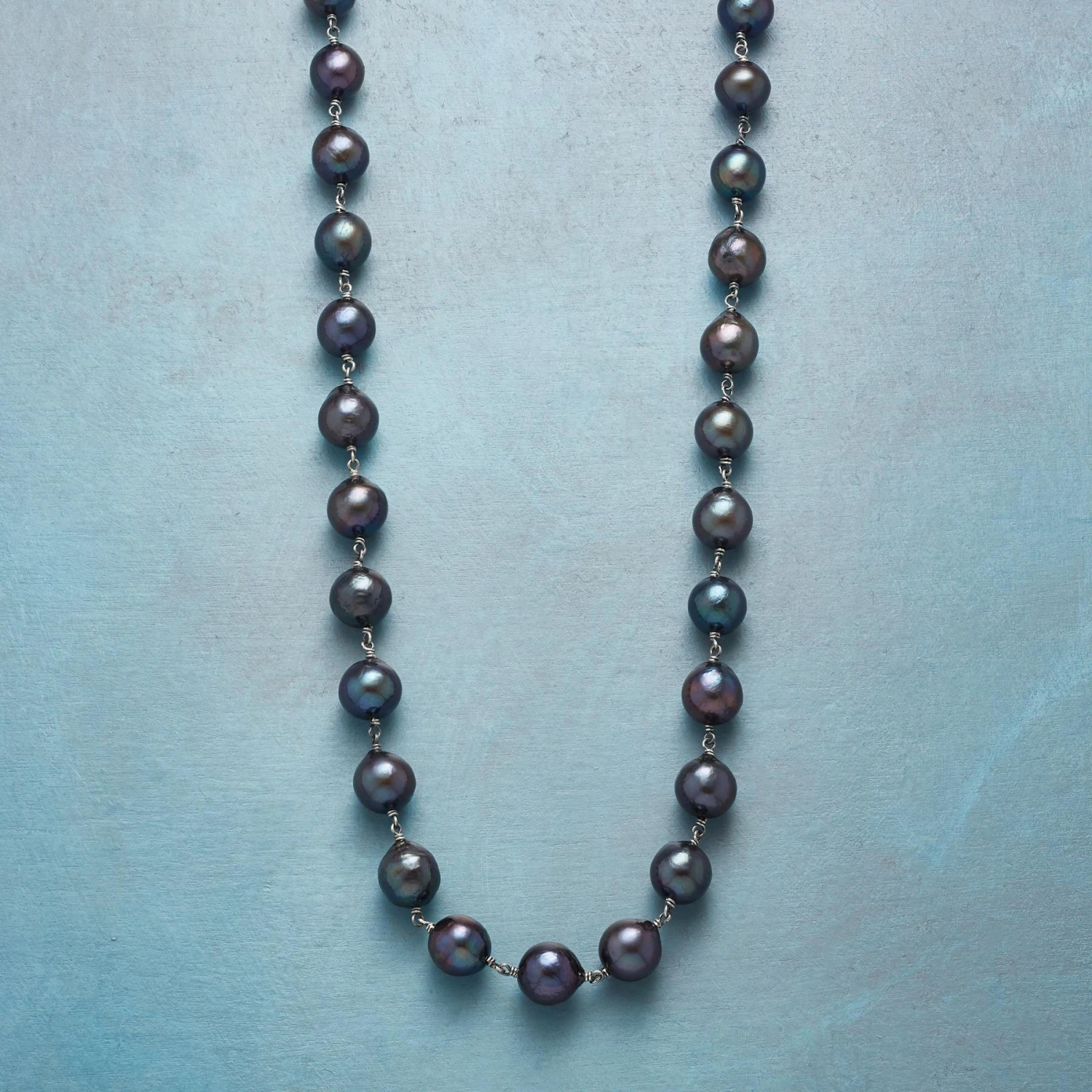 Each irregular cultured freshwater pearl is an iridescent expression of individuality, boldly tinted with peacock hues. Exclusive. Handmade by Chan Luu with oxidized sterling silver links; lobster clasp. 18″L.