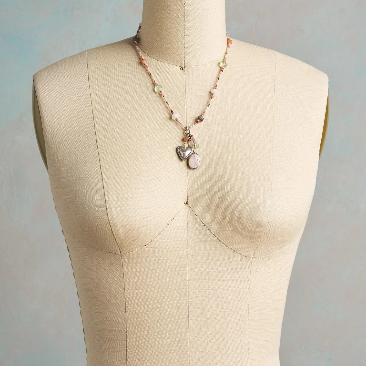 Gemstones and cultured pearls populate the strand, culminating in heart and mother of pearl charms. Exclusive. Handcrafted with sterling silver; heart toggle clasp. 18″L; 1-7/8″ drop.
