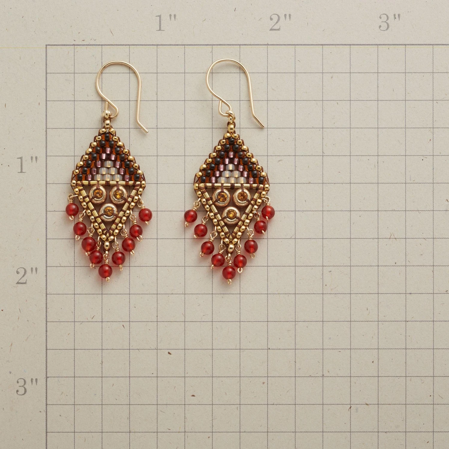 These handcrafted beauties shimmer with Swarovski crystals, Japanese Miyuki beads and a shower of carnelian falling like raindrops. 14kt gold filled wires. USA. Exclusive. 2″L.