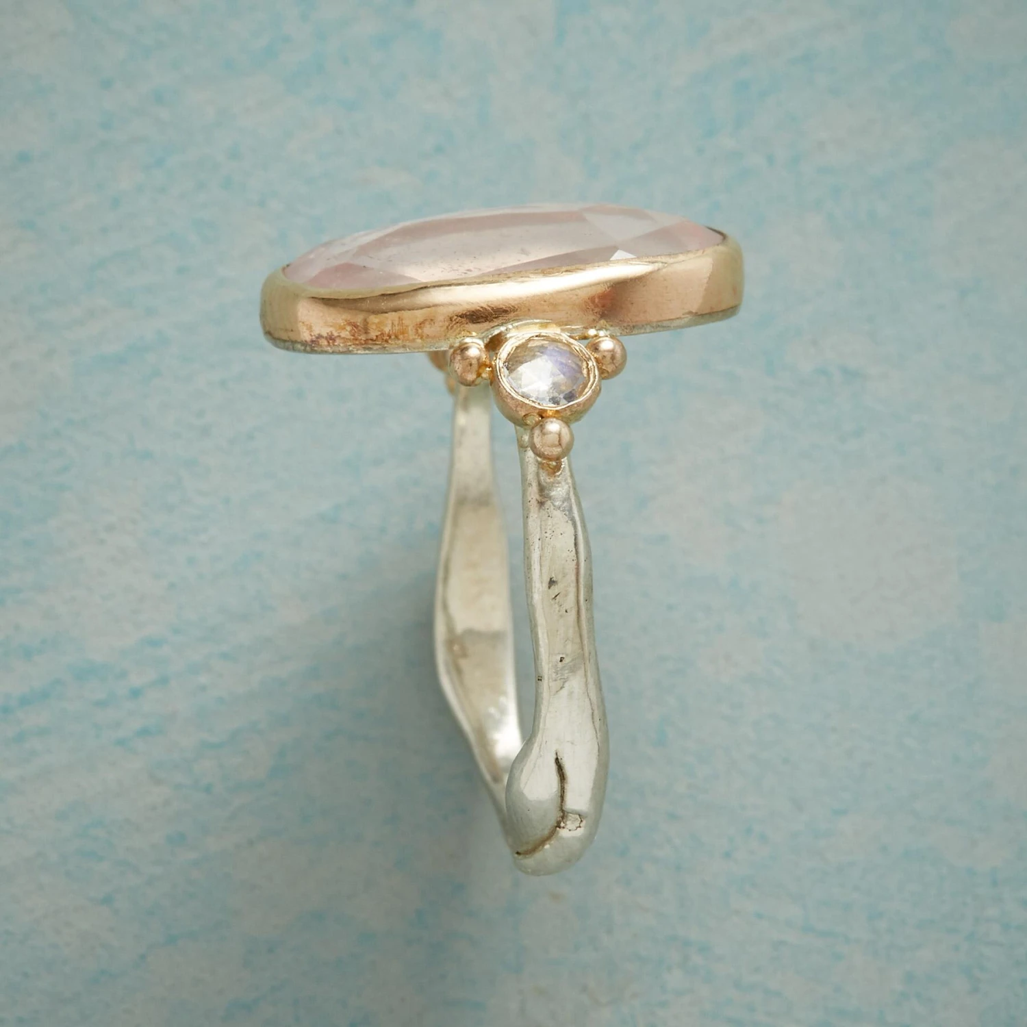 Sheer, freeform rose quartz reveals a shimmering backdrop, flanked by faceted moonstones. Handmade in USA with 14kt gold bezels, irregular sterling silver band. Emily Amey. Exclusive. Whole sizes 5 to 9.