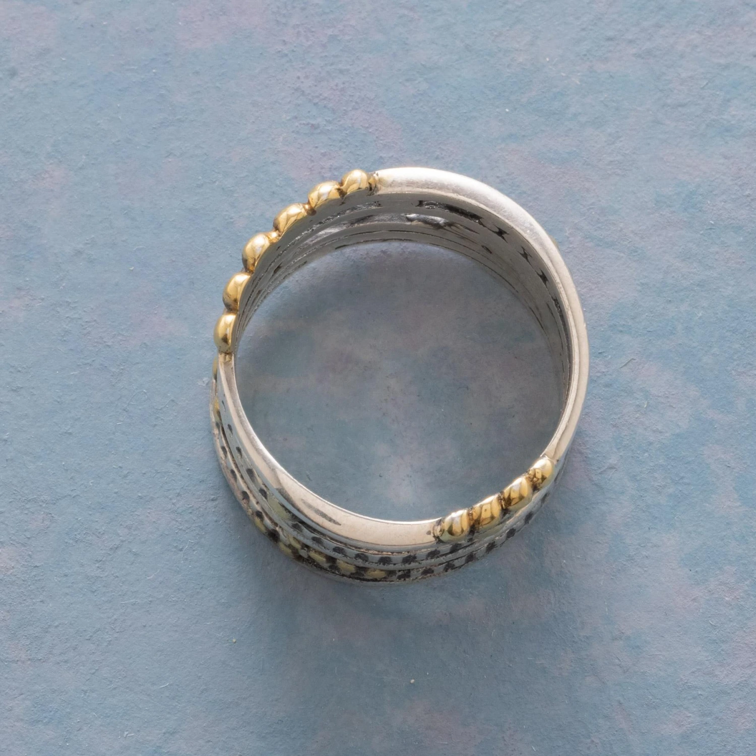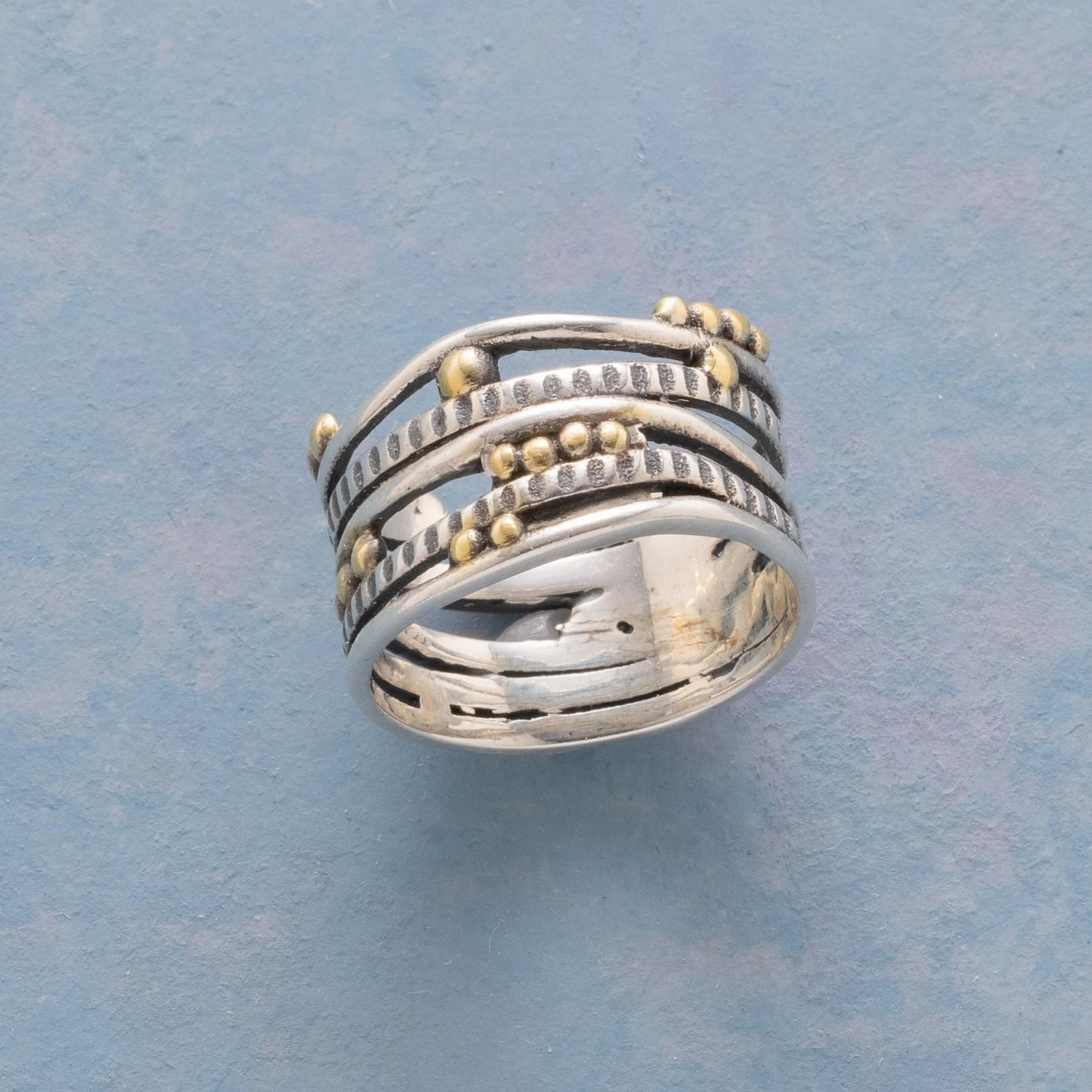 Five fused sterling silver bands—wavy and straight, smooth and textured—are interspersed with 14kt gold-plated beading to make a statement from every angle. Exclusive. Whole sizes 5 to 10. Approx. 1/2″W.