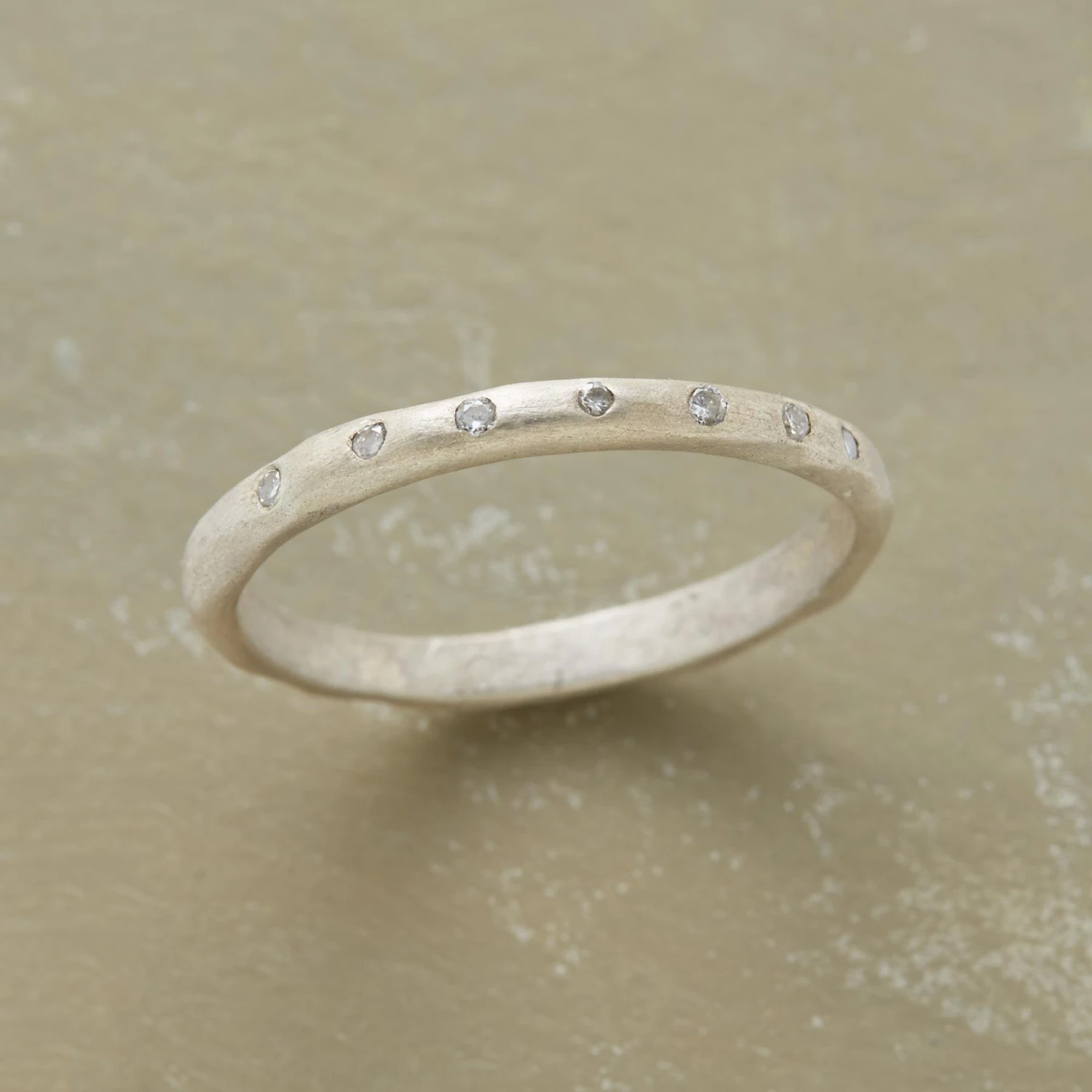 Seven delicate diamonds atop the finger are points of light emerging from matte-finished sterling silver. Kyoko Honda’s slender, irregular, hammered band is handmade in USA. Whole sizes 5-9.