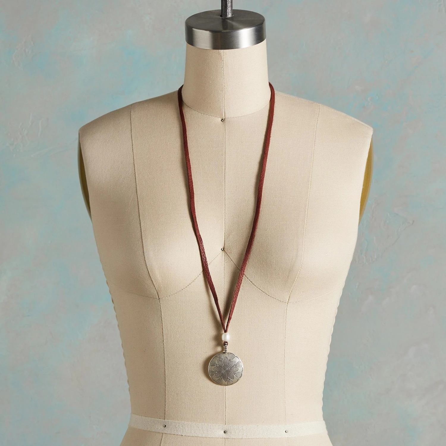 A spiral-centered flower blooms on our medallion, hand-stamped on softly domed Thai silver beneath a shimmering cultured freshwater pearl. Two more pearls trim the soft leather laces, which adjust with a Thai silver slider. Handcrafted. Exclusive. Adjustable to 30″l drop; 1-1/2″ disk.