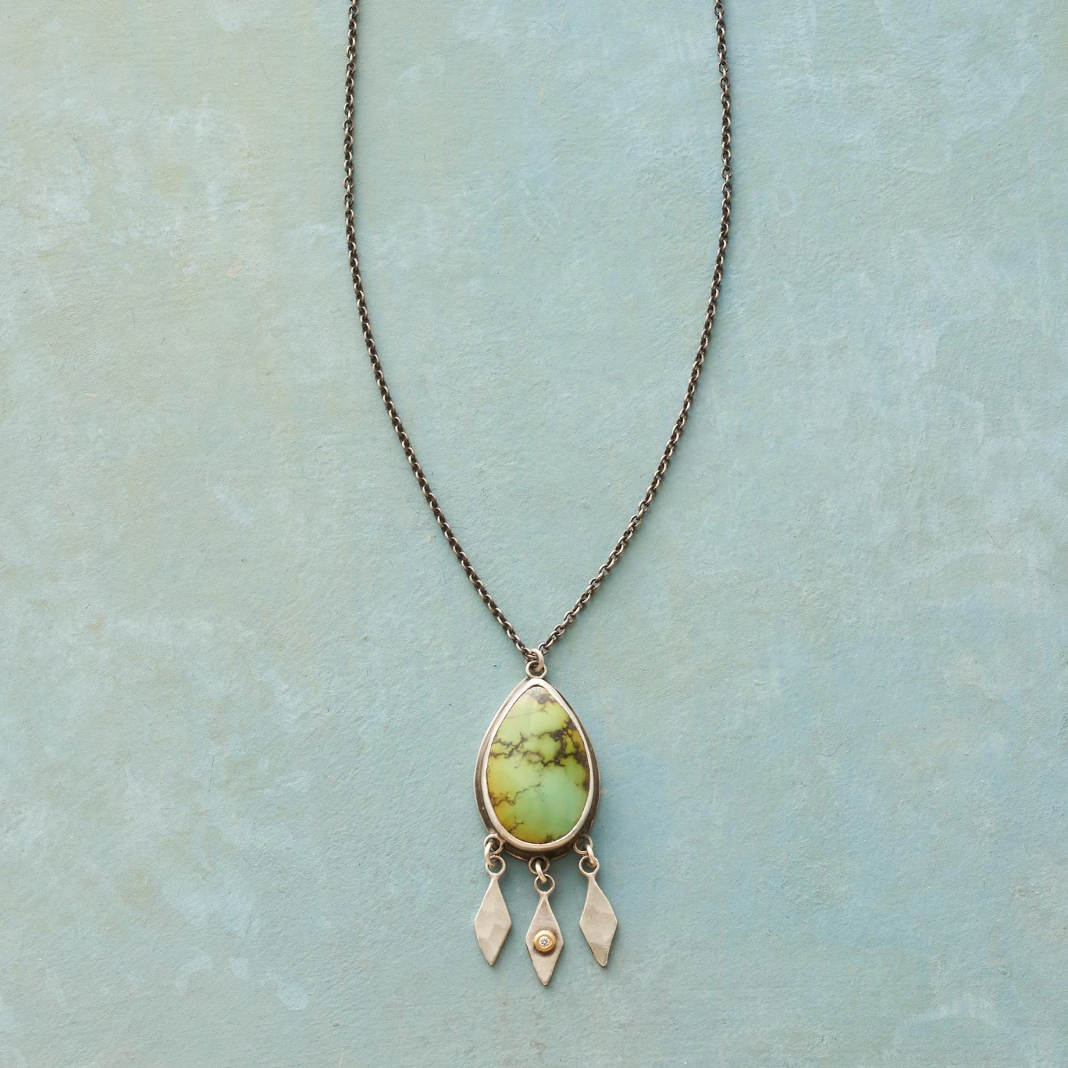 Turquoise teardrop dangles a trio of fluttering tabs, one studded with a diamond set in 22kt gold. Handmade in USA of sterling silver. By Ananda Khalsa. Lobster clasp. 16″l; 1-1/4″ drop.