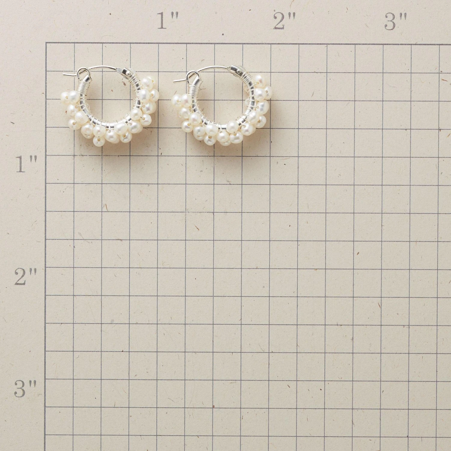 A pair of wired hoop earrings, with little cultured pearls enveloping sterling silver hoops in a luminous froth. The gems are wired by hand; the earrings finished with snap down wires. Made in USA. 5/8″L.