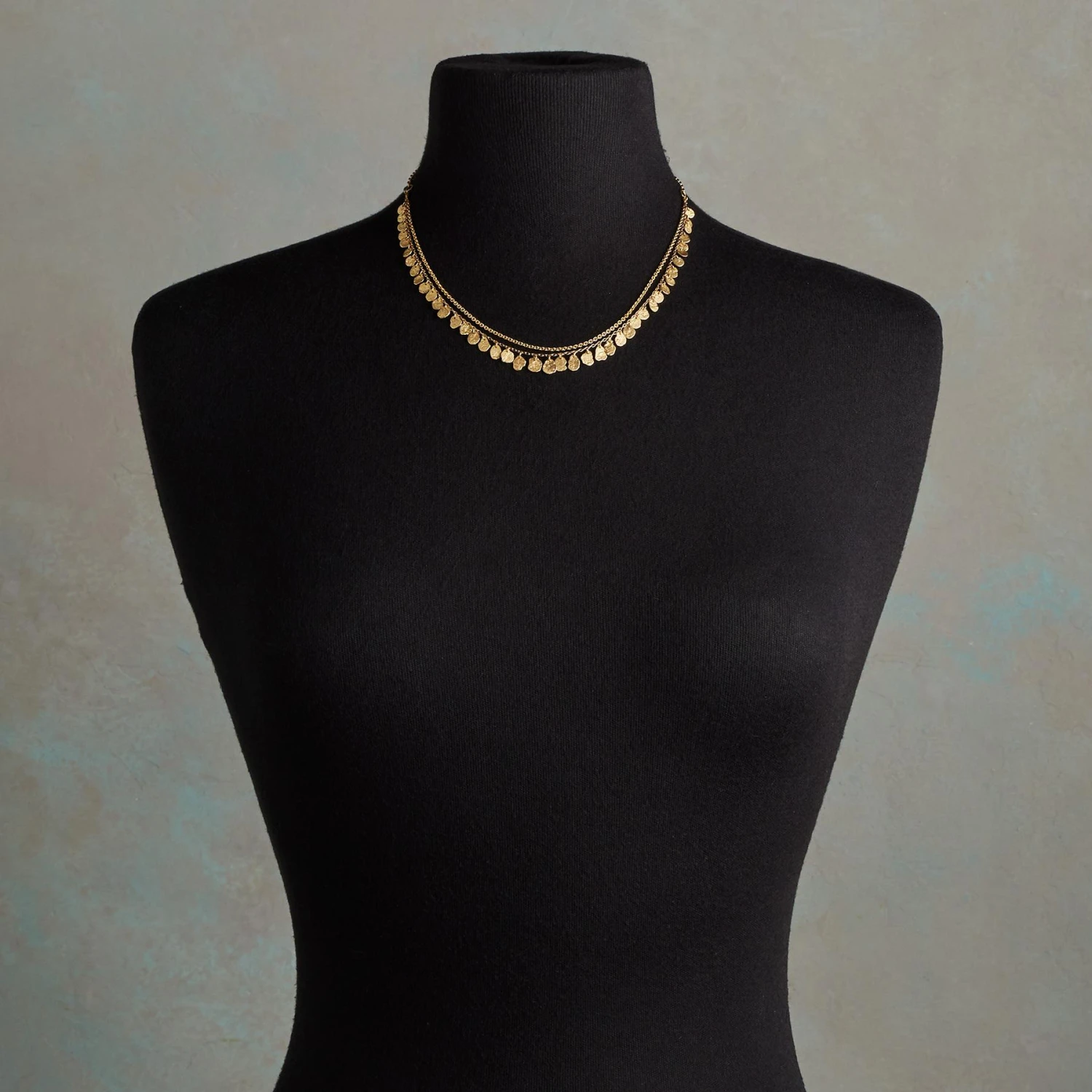 Sarah McGuire spangles a double-strand chain of 14kt gold with 18kt gold discs, individually crafted and hammered to ripple with light. The result is a shimmering torrent of gold that drapes and flutters as you move. Hook clasp. Handmade in USA. 18″L.