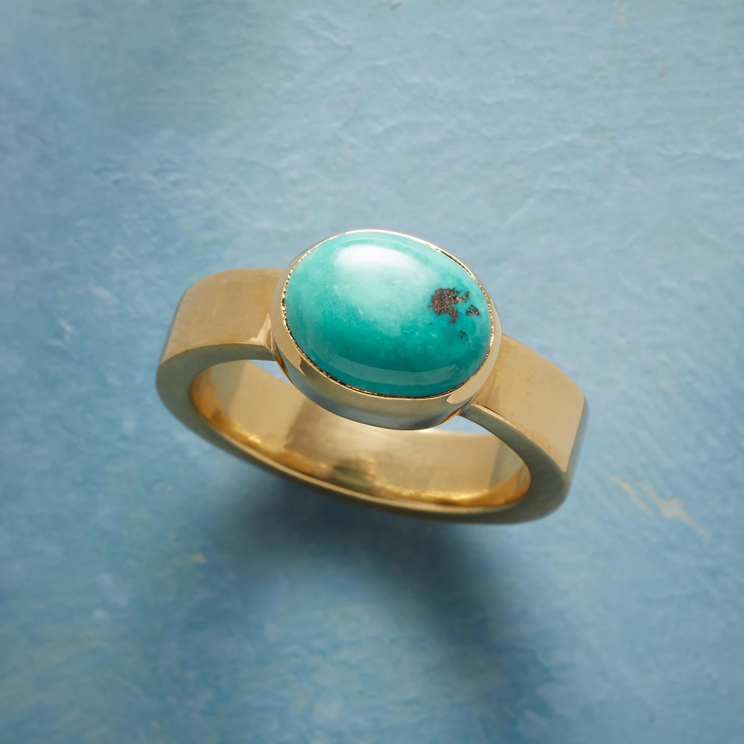 There’s no mistaking this bold presentation of turquoise, a domed oval set amid the glow of 14kt gold vermeil. Sundance Exclusive. Handcrafted in whole sizes 5-9.